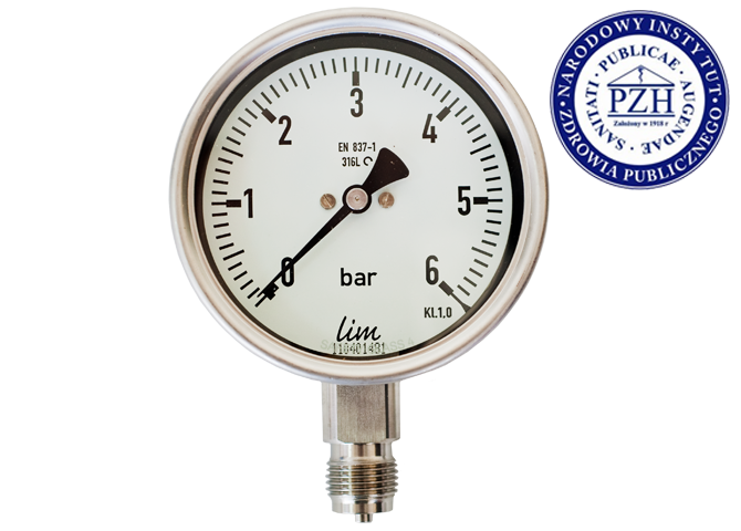 Pressure gauges dedicated to the food industry, where a PZH (food-contact) certificate is required. Thanks to the materials used, the medium temperature can reach up to 200 °C. When a liquid filling is applied, the maximum operating temperature is reduced to 100 °C. The gauges are resistant to contaminants such as dust, vapors, and atmospheric conditions.
