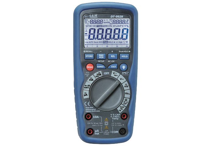 DT-9929/9939 are the new Professional Digital Multimeters which provide much more safe measurements with double molded plastic housing design and IP67 waterproof function. 9929/9939 performance like data logger &True RMS AC voltage and current measurements, 40,000 counts resolution and a 0.06% basic DC accuracy within the reach of more customers. The large LCD display with analog bargraph and backlit ensure that readings are easy to read under all circumstances.