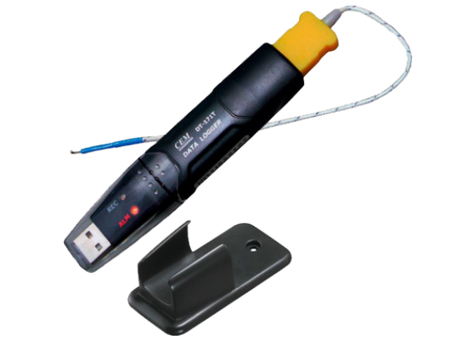 DT-171T is a portable temperature recorder with an external measurement probe, used in the food, pharmaceutical, laboratory, refrigerated transport, and wherever recording of environmental parameters in quality systems is required. The recorder has an internal memory of 32 k, a USB port for communication with a PC and the REC and ALM diodes to inform the user about the device status. The set includes a sturdy handle and software for the analysis of measurement data.