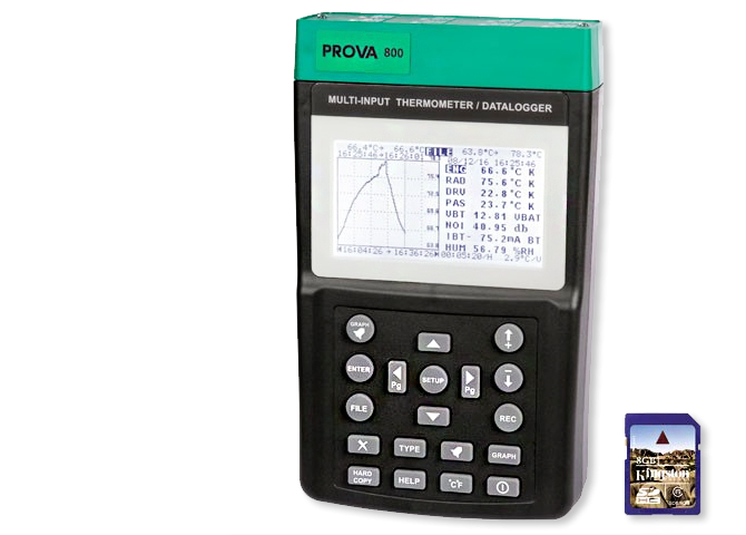 Prova 800 is a modern, portable recorder of process parameters, intended mainly for temperature recording. The recorder allows you to connect up to 8 different sensors from among 11 types of thermocouples and simultaneously record the measurement results for each of them. The results are displayed as numbers or graphs. The set includes temperature sensors type ATPK-01. Thanks to additional adapters, it is possible to record current and voltage signals. The meter has an SD memory card slot (2GB included)