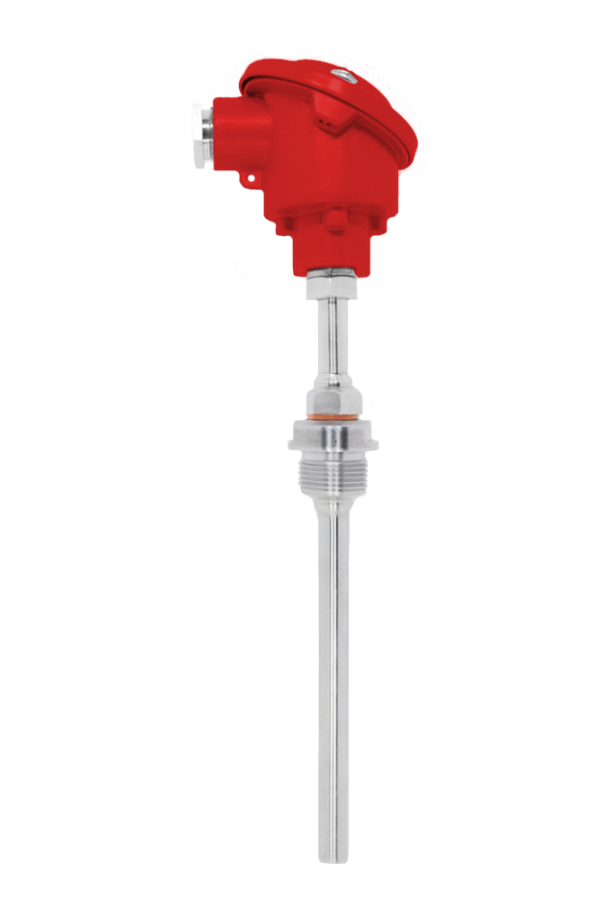 Temperature sensor suitable for measurement of liquid and gaseous media. Tight connection of the sensor and thermowell prevents leakage of installation and enables adjustment to the thickness of insulation layer. This sensor has a spring-loaded replaceable measuring insert. Adequate for various applications, mainly on ships and vessels.