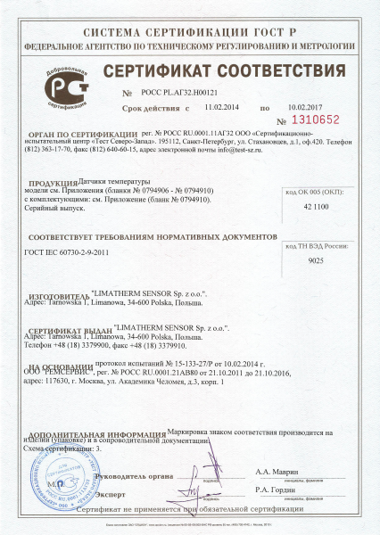 Due to exporting our products to the markets of Eastern Europe, the company Limatherm Sensor Sp. z o.o. received a certificate of conformity GOST-R - certificate attesting the conformity of production with quality and safety requirements, established for the production of existing standards and norms in the Russian Federation.