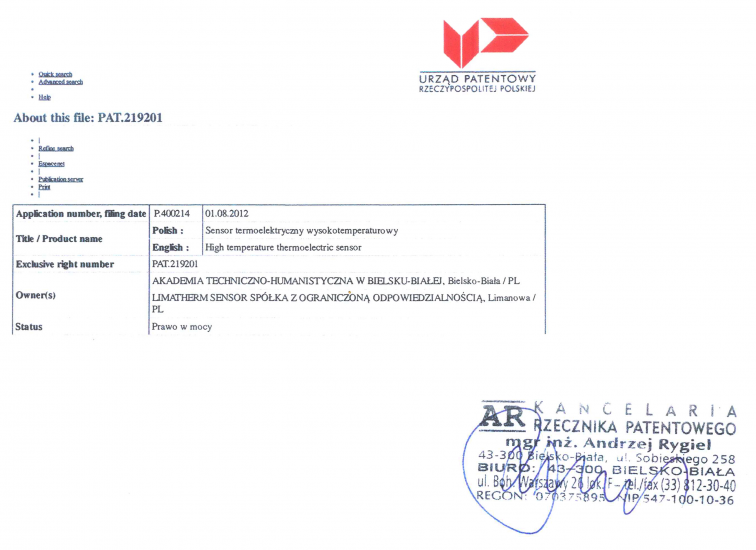 It is our great pleasure to announce that Limatherm Sensor as first in Poland received a patent for a high temperature thermoelectric sensor. Limatherm Sensor in co-operation with the Academy of Science and Humanities in Bielsko-Biala, designed and created the innovative design of the sensor having resistance to temperatures up to 2300°C. Sensor design is based on a tungsten-rhenium thermocouple with use of molybdenum thermowell.