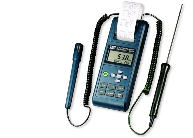 Przenośny miernik wyposażony w 2 sondy temperatury i wilgotności. Potrójny wyświetlacz, możliwość podłączenia trzeciej dodatkowej sondy temperatury, wyposażony dodatkowo w drukarkę termiczną.