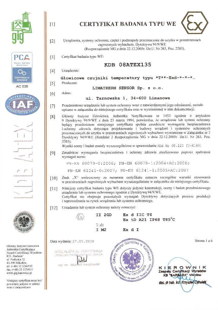 Czujnik przeznaczony jest do pomiaru temperatury mediów ciekłych i gazowych. Wyposażony jest w wymienny wkład pomiarowy, co pretenduje go do zastosowania w wielu aplikacjach przemysłowych, a jego wymiana nie powoduje rozszczelnienia instalacji technologicznej. Sprężynujące mocowanie wkładu zapewnia doskonały kontakt z osłoną czujnika. Czujnik posiada dopuszczenie do stosowania w strefie zagrożonej wybuchem: I M2 Ex d I Mb (z głowicą NS) II 2G Ex d IIC T6 Gb II 2D Ex t IIIC T85ºC Db IP66